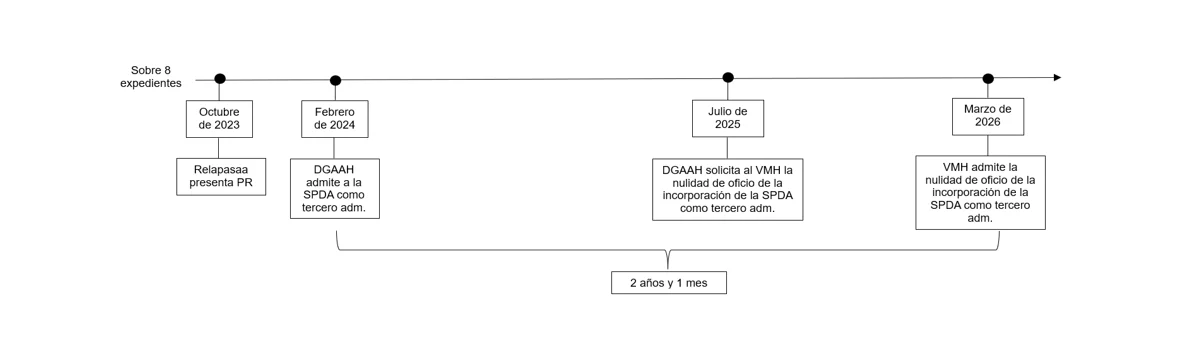 En mayo de 2024, de una revisión de la página web del Minem, la SPDA advirtió que el Viceministerio de Hidrocarburos había emitido seis resoluciones viceministeriales, a través de las cuales resolvió declarar nulas seis resoluciones directorales que admitieron a la SPDA como tercero y determinó que la DGAAH se pronunciara de nuevo. Este pronunciamiento del Viceministerio de Hidrocarburos partía de un recurso de apelación presentado por Relapasaa en diciembre de 2023, el cual nunca fue notificado a la SPDA y, donde de origen, observamos una irregularidad procedimental y una desigualdad en el tratamiento a las partes administrativas del procedimiento. Así, el Viceministerio de Hidrocarburos argumentó, entre otros puntos, que la presencia de la SPDA generaba indefensión a Relapasaa y que había mecanismos de participación ciudadana a través de los cuales la SPDA podía presentar sus aportes al procedimiento de evaluación ambiental.