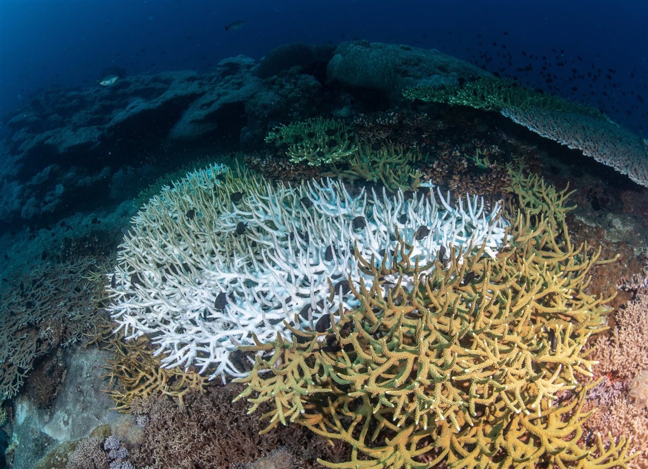 Actualmente, el 77 % de arrecifes de coral han sido afectados por el blanqueamiento. Este es un proceso ambiental en el que se expulsan microalgas encargadas de proporcionarles nutrientes a sus tejidos, tornándose de un color blanco. Esto sucede debido a estrés ambiental causado por el aumento de la temperatura del agua, la acidez o luz solar.