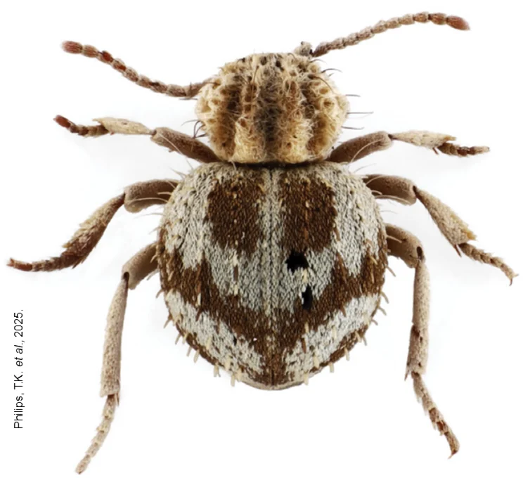 Los escarabajos del género Trigonogenius son pequeños coleópteros conocidos como “escarabajos araña”, caracterizados por su aspecto globoso y hábitos asociados a ambientes áridos. La nueva especie se distingue por surcos longitudinales muy marcados en el pronoto y patrones definidos en los élitros, rasgos que la diferencian de otras especies del género registradas en el país.