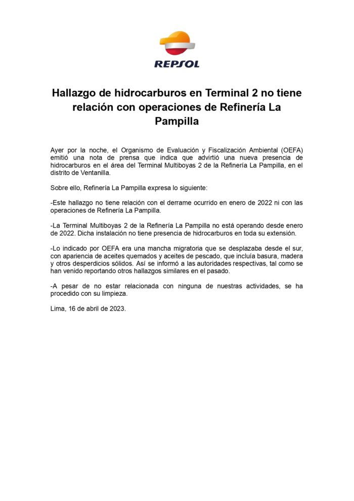 A través de un comunicado, la empresa Repsol indicó que esta presencia de hidrocarburos no guarda relación con el derrame producido el 15 de enero de 2022, ni con las operaciones de la refinería porque el mencionado terminal no opera desde el año pasado.
