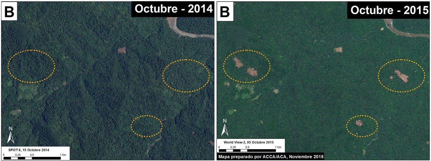 MAAP también mostró en otra imagen la deforestación de 40 hectáreas (equivalente a 55 campos de fútbol) entre octubre del 2014 (panel izquierda) y octubre del 2015.