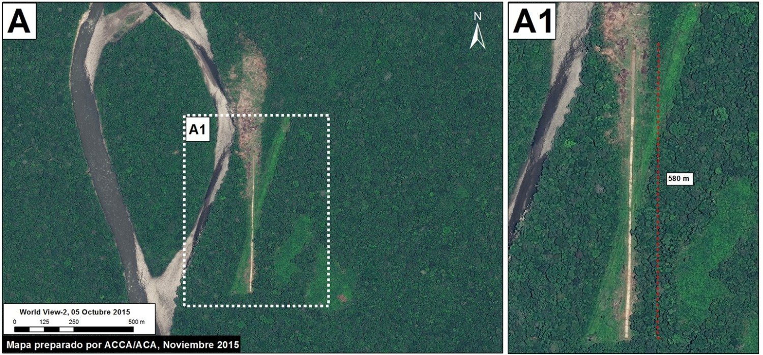 MAAP recordó además que esta área había sido deforestada anteriormente con la misma finalidad en el 2013, pero fue inhabilitada durante el 2014. En esta zona, conocida como el sector Colorado, se había presentado la deforestación de 538 hectáreas entre 2000 y 2014, además poseía una alta densidad de cultivos de coca.
