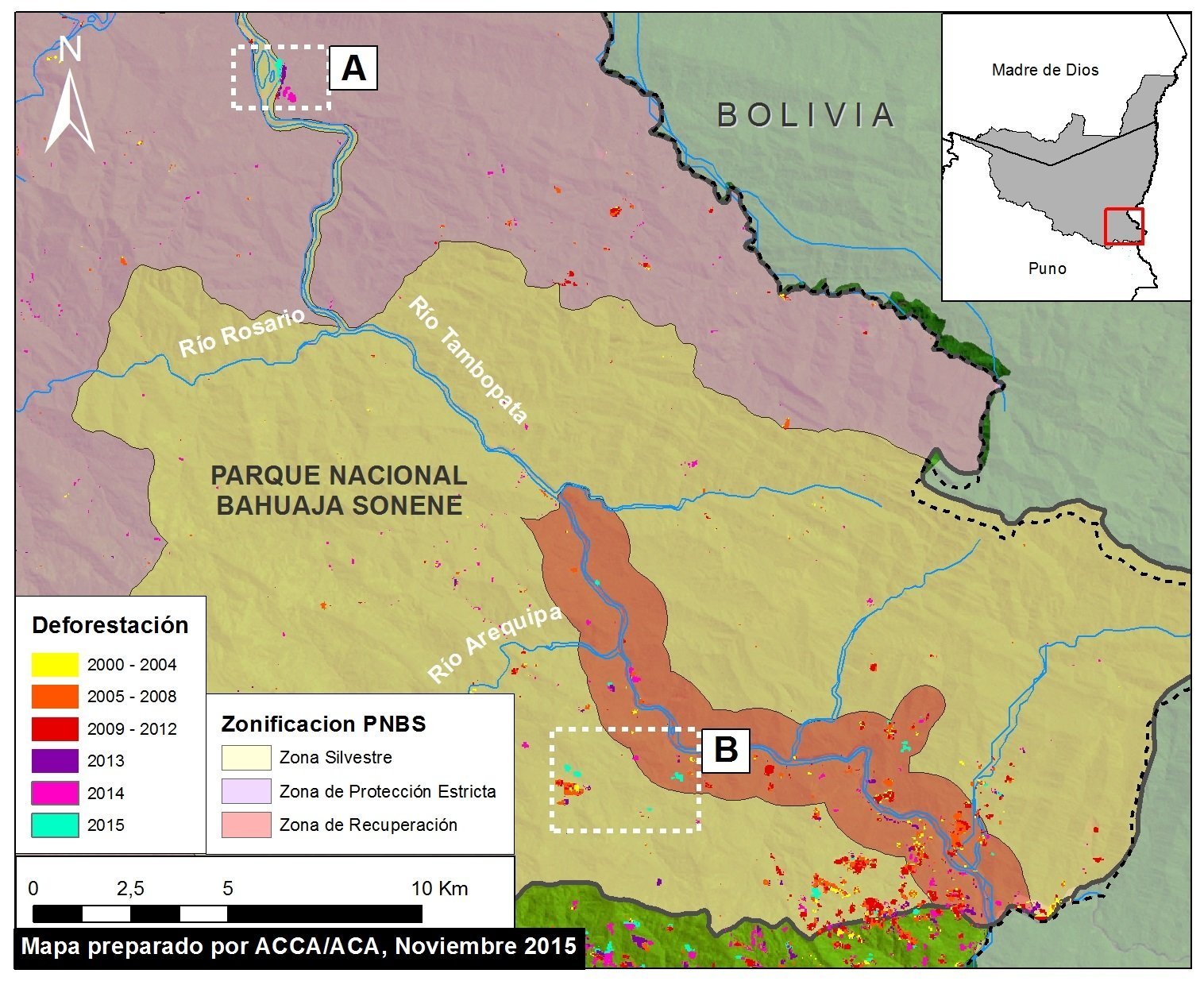 Una pista de aterrizaje ilegal de 580 metros de largo y 8 de ancho fue detectada dentro del Parque Nacional Bahuaja Sonene (ubicado entre Puno y Madre de Dios). Según los especialistas del Proyecto MAAP, quienes realizan el monitoreo constante de la Amazonía a través de imágenes satelitales, esta pista está ubicada dentro de zonas de cultivos de hojas de coca y serviría para el aterrizaje de avionetas en zonas de protección estricta y silvestre.