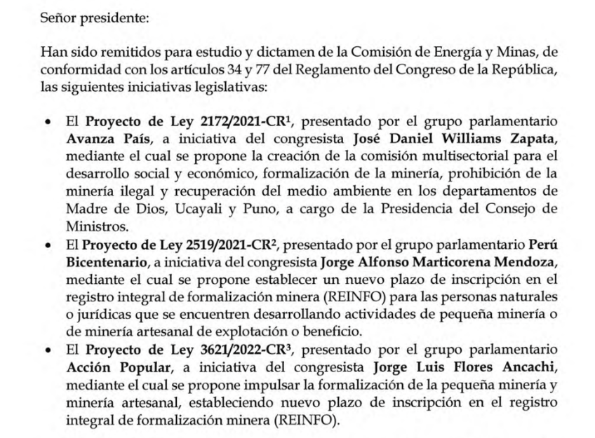 Uno de estos dictámenes es el que contiene los proyectos de ley 2172/2021-CR, 2519/2021-CR y 3621/2022-C, el cual propone una vez más la ampliación del proceso de formalización minera, una medida criticada por especialistas y la propia Fiscalía Especializada en Materia Ambiental (FEMA) porque beneficiaría a la minería ilegal y obstruiría los operativos contra esta actividad.