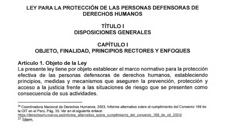 Otro dictamen que podría debatirse es el que recae en el Proyecto de Ley 2069/2021-PE, el cual propone la primera ley para la protección de las personas defensoras de derechos humanos en el Perú, «estableciendo principios, medidas y mecanismos que aseguren la prevención, protección y acceso a la justicia frente a las situaciones de riesgo que se presenten como consecuencia de sus actividades». Esta norma fue propuesta debido a las amenazas y ataques que han sufrido y sufren los defensoras ambientales en los últimos años. Según la Asociación Interétnica de Desarrollo de la Selva Peruana (Aidesep), solo en los últimos diez años han sido asesinados más de 30 personas por defender el ambiente y sus territorios.