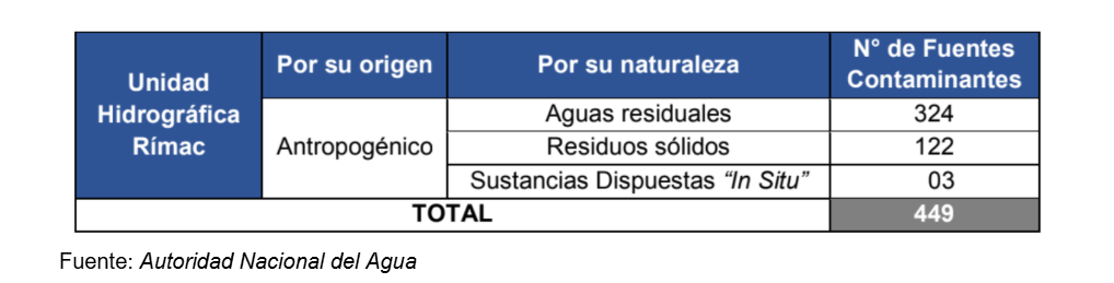 Las fuentes contaminantes del río Rímac son diversas y localizadas tanto en la cuenca alta, media y baja. Según el último informe de la ANA del 2020[8], en esta unidad hidrográfica se identificaron 449 fuentes contaminantes de origen antropogénico[9].