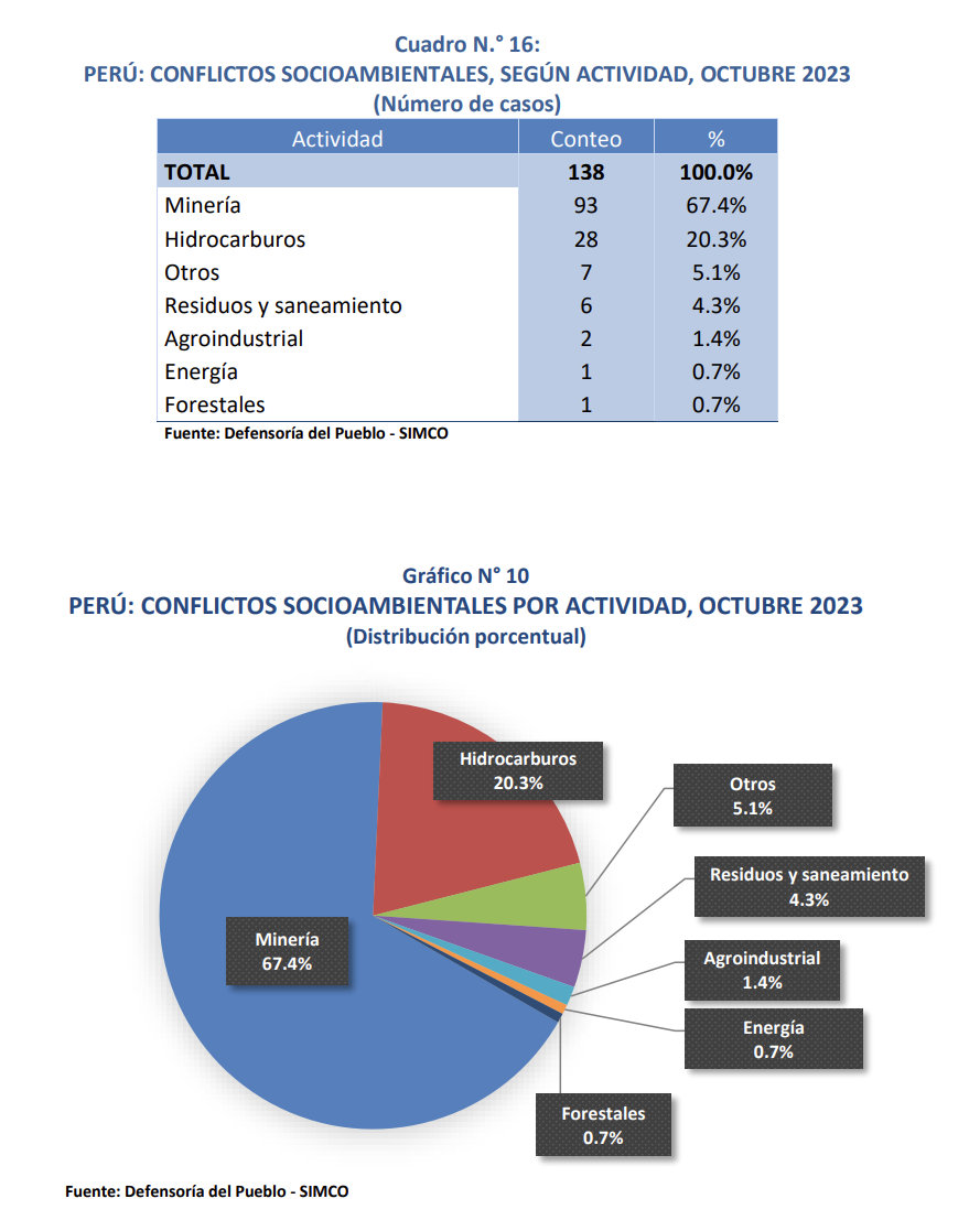 En su último reporte de octubre, la Defensoría del Pueblo registró 224 conflictos sociales, de los cuales 138 son socioambientales, y de esta última cifra 93 están ligados a la minería y 28 al sector hidrocarburos.