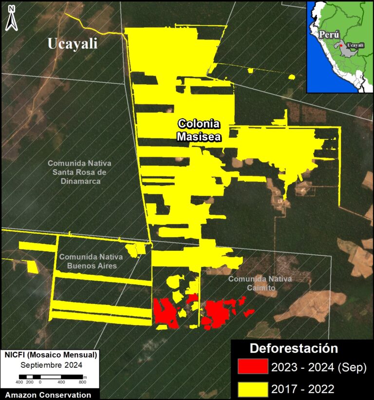 El reporte de MAAP también resalta que el Servicio Nacional Forestal y de Fauna Silvestre (Serfor) ha recibido cinco denuncias por actividades de deforestación sin autorizaciones para el desbosque, las cuales han sido derivadas a las entidades competentes. Asimismo, mediante un proceso judicial, ante la Segunda Sala Penal de Apelaciones de la Corte Superior de Justicia de Ucayali, ratificó la suspensión de actividades depredatorias de desbosque y tala por parte de la colonia en julio del 2023.