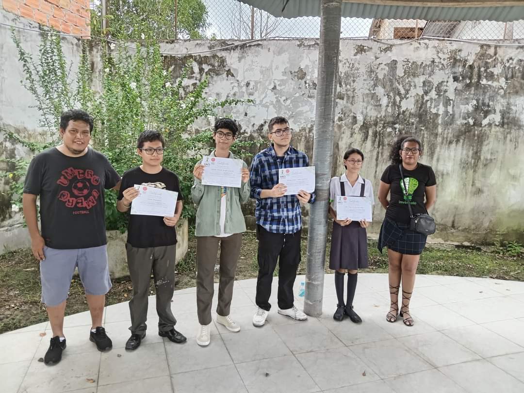 Los ganadores del concurso. En los extremos, Angela Nuñez del Equipo Invéntalo, y Frank Villacorta, presidente del Capítulo Forestal CIP Loreto. Foto: Angela Nuñez