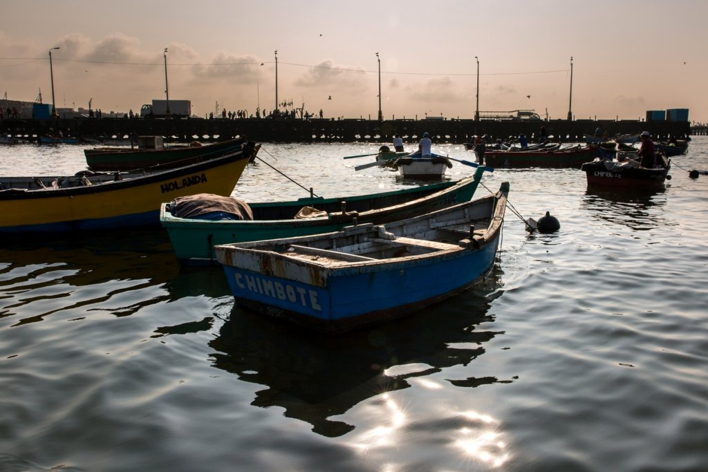 - Muelle principal de Chimbote. Estas pequeñas embarcaciones que se mueven a remo, son usadas para trasladarse desde el muelle a otras más grandes.