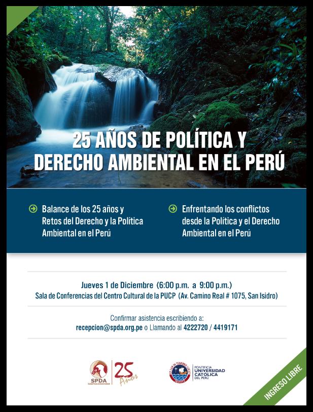 La Sociedad Peruana de Derecho Ambiental (SPDA), en el marco de sus actividades académicas por sus 25 años de vida institucional, realizará la conferencia “25 años de Derecho y Política Ambiental en el Perú”, un evento que tiene como fin destacar los retos del derecho y la política ambiental pendientes en nuestro país.