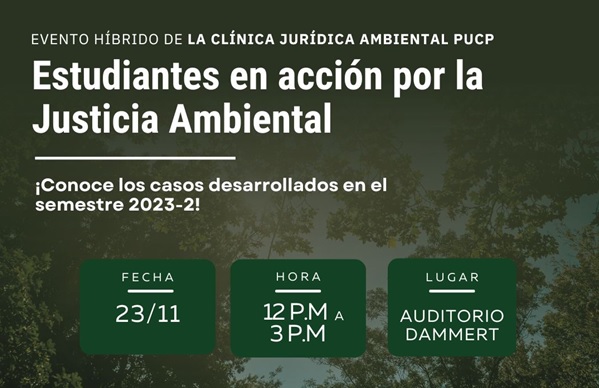 - La Clínica Jurídica Ambiental de la Facultad de Derecho de la PUCP, en colaboración con la Fundación para la Conservación y el Desarrollo Sostenible (FCDS) y Educational Partnerships for Innovation in Communities (EPIC-Network), presentan este 23 de noviembre el evento híbrido: “Estudiantes en Acción por la Justicia Ambiental”