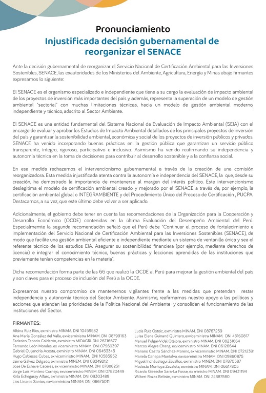 El pronunciamiento está firmado por Albina Ruiz, Lucía Ruiz, Manuel Pulgar-Vidal, Kirla Echegaray, Gabriel Quijandría, Modesto Montoya, Ricardo Giesecke y Wilbert Rozas, todos ellos extitulares del Minam. Asimismo, se sumaron otros exfuncionarios de diversas carteras.