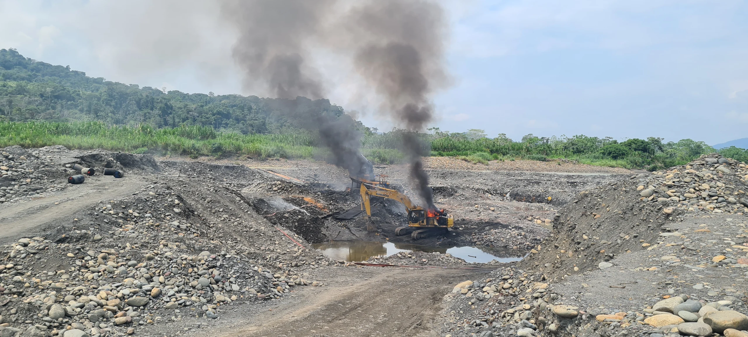 En esta última intervención se hallaron maquinarias pesadas como cuatro retroexcavadoras, ocho motores estacionarios, dos campamentos, 600 galones con petróleo, entre otros insumos para la actividad minera.