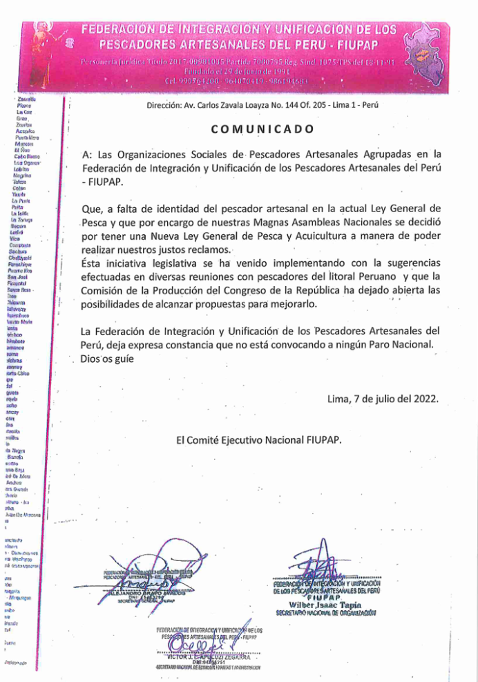 A su vez, el comunicado oficial de la FIUPAP señala que el proyecto de ley “se ha venido implementando con las sugerencias efectuadas en diversas reuniones con pescadores del litoral peruano” y desmiente la convocatoria a un paro nacional.