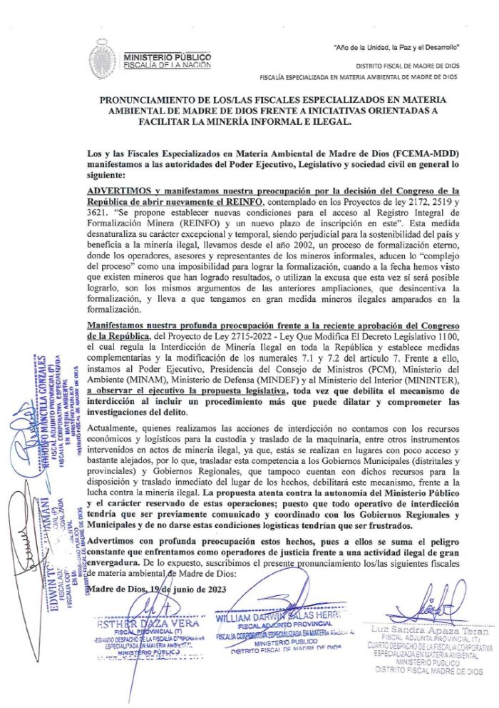 Según el pronunciamiento de los fiscales ambientales, esta propuesta “es perjudicial para la sostenibilidad del país y beneficia a la minería ilegal” porque alarga más el proceso de formalización que inició el 2002, hace 21 años. Asimismo, indican que el argumento de algunos mineros es que la formalización tiene un “complejo proceso” pero a la fecha sí existen mineros que han logrado formalizarse.