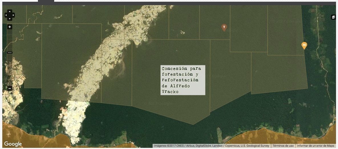 Al centro de la imagen, con más de 2500 hectáreas, la concesión de Alfredo Vracko. Al lado izquierdo se puede apreciar cómo la minería ilegal ha arrasado bosques y concesiones forestales. Imagen: Alerta Ambiental.