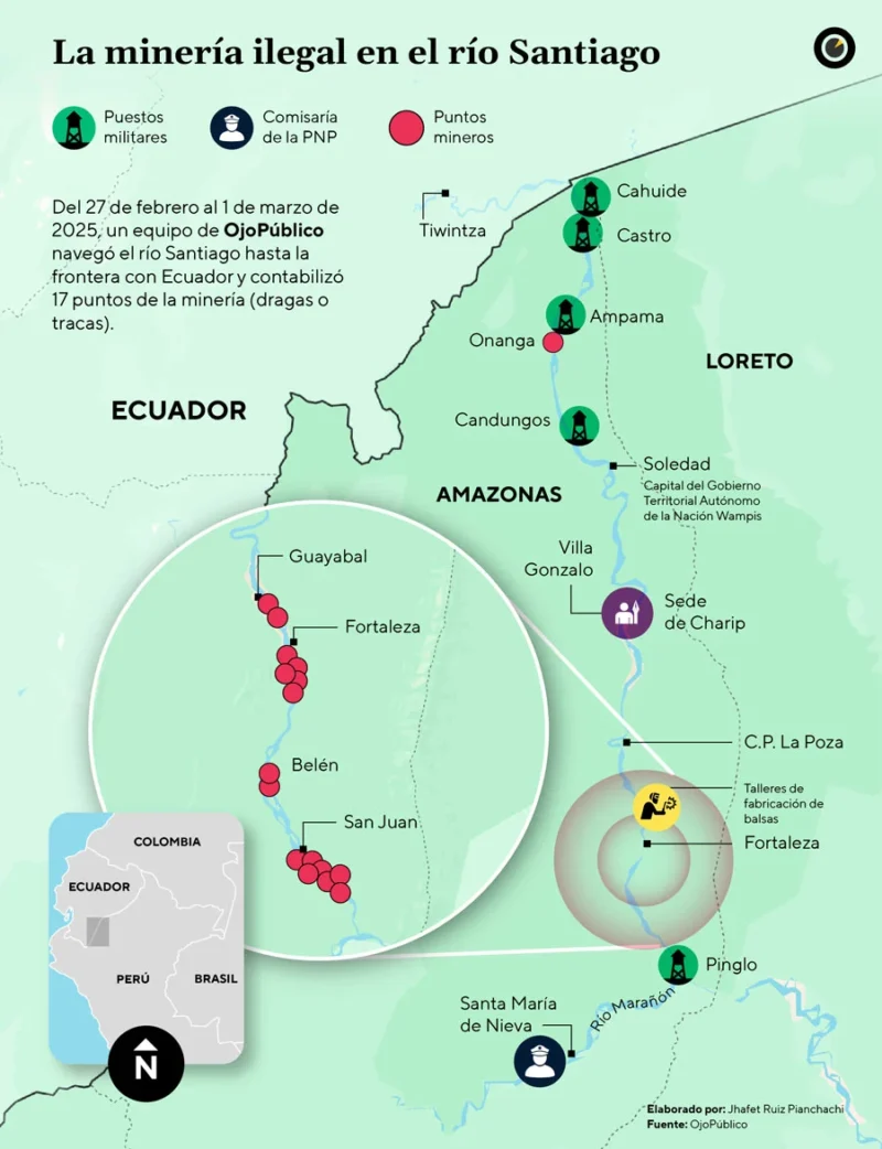 - Reportaje de Ojo Público identificó 17 zonas donde se extrae oro, las cuales están ubicadas en el distrito de Río Santiago (Amazonas). Policía sabe del problema, pero -según comunidades indígenas- no actúan contra esta actividad.