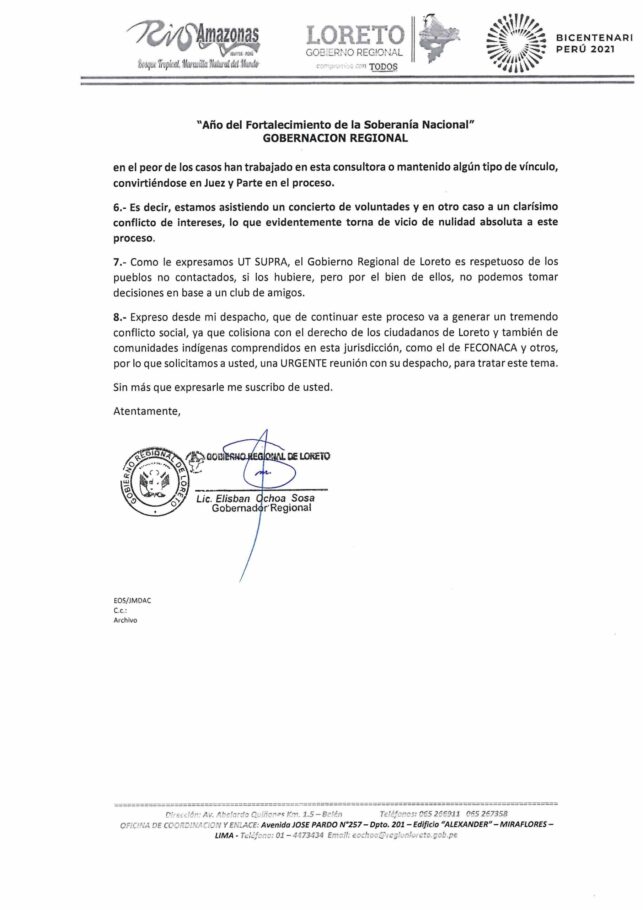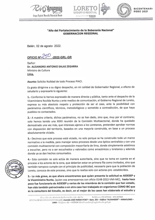 El pasado 2 de agosto, el gobernador regional de Loreto, Elisbán Ochoa, dirigió un oficio al ministro de Cultura, Alejandro Salas, para solicitar la nulidad del reconocimiento de los pueblos indígenas en situación de aislamiento y contacto inicial (PIACI).