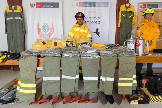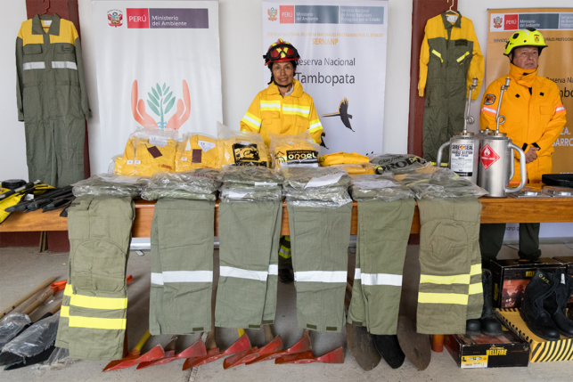 En la entrega de estos equipos e indumentaria también estuvieron presentes Christian Huamán Mendoza, director de Gestión de las Áreas Naturales Protegidas del Sernanp; Víctor Zambrano, presidente del Comité de Gestión de la Reserva Nacional de Tambopata; bomberos de Puerto Maldonado, entre otros invitados.