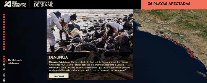 El especial sigue una cronología con imágenes, texto, fotos y videos de los sucesos más importantes a raíz del vertimiento del crudo en mar peruano. En este también se incluye información sobre la contaminación de 40 playas.