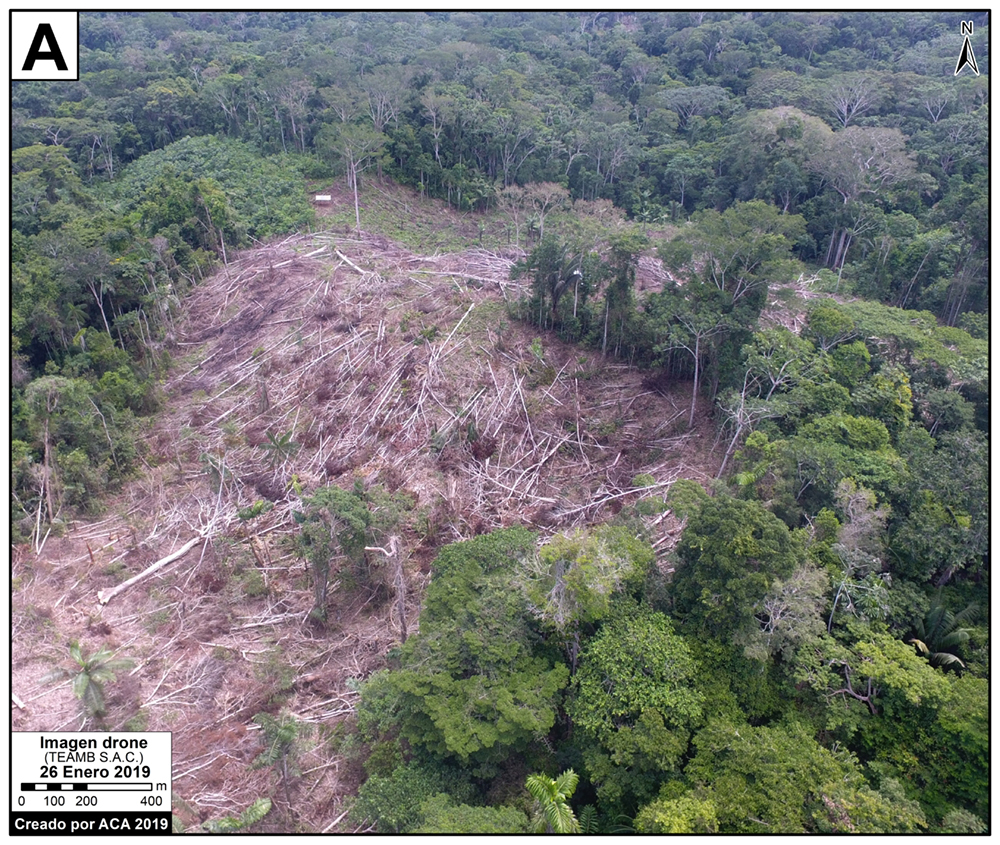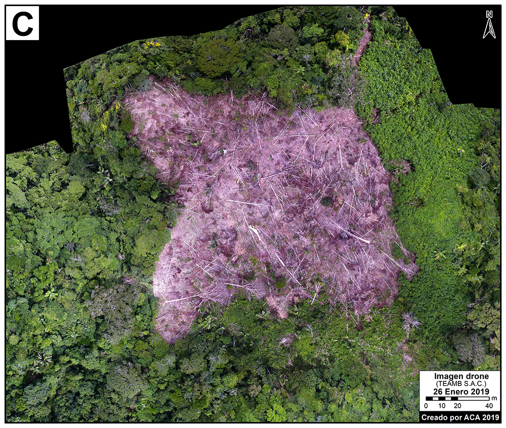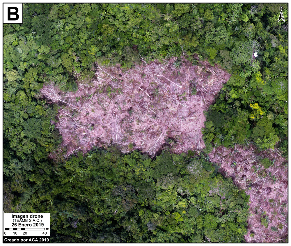 El informe detalla imágenes obtenidas a partir de un sobrevuelo con dron, realizado en enero del 2019, donde se muestra la reciente deforestación en la zona.