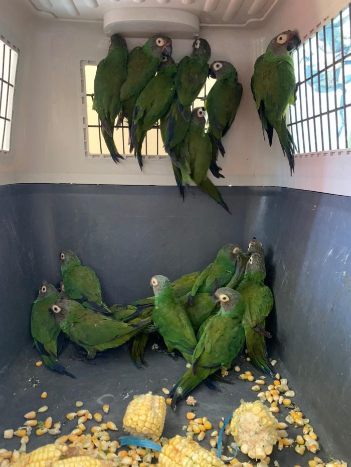 Según informó Serfor, los ejemplares eran trasladados en pares, dentro de bolsas de tela en cuyo interior contenían mazorcas de maíz como alimento. Las bolsas estaban amarradas con rafia y se encontraban apiladas en dos jabas de plástico. Para evitar que se escapen tenían las alas cortadas y las bolsas se hallaban sujetas a lo largo de dos filas de nylon que cruzaban los extremos.