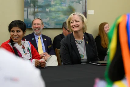 Debra Anne Haaland, con busa blanca y saco negro, atendió a los jóvenes indígenas peruanos. Foto: Gillian Hagamen / Universidad de Wake Forest