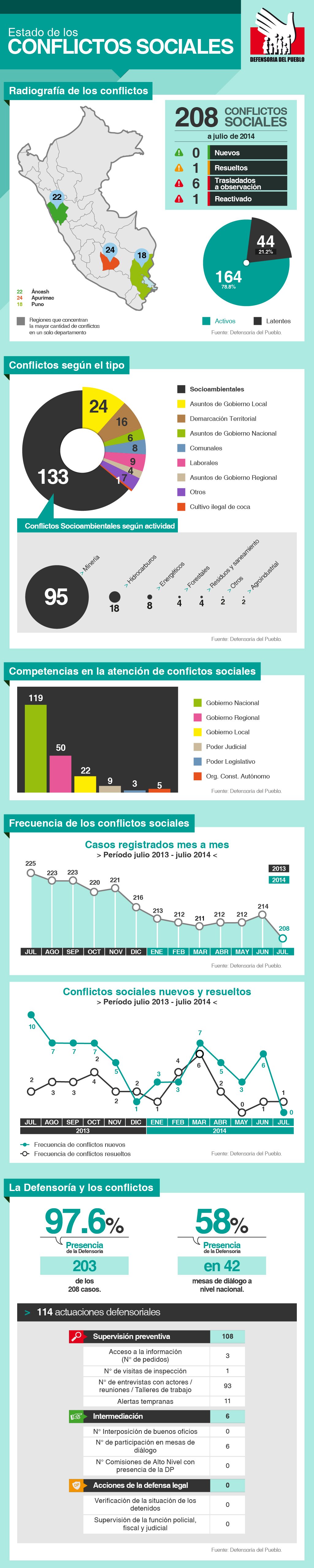 La Defensoría del Pueblo informó que en el mes de julio se registraron 208 conflictos sociales, de los cuales 164 están en calidad de activos y 44 en estado latente, lo que muestra una reducción respecto al mes pasado.
