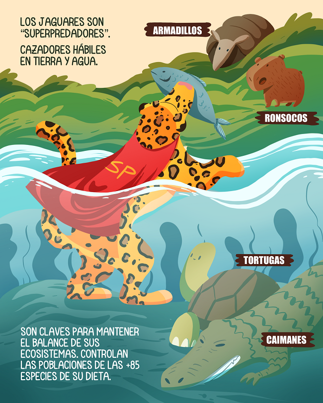El jaguar es un “superpredador”, es decir, se encuentra en la cima de la cadena alimenticia de los ecosistemas que habita. Además de ello, a diferencia de otros grandes felinos, es un hábil cazador tanto en tierra como dentro del agua.