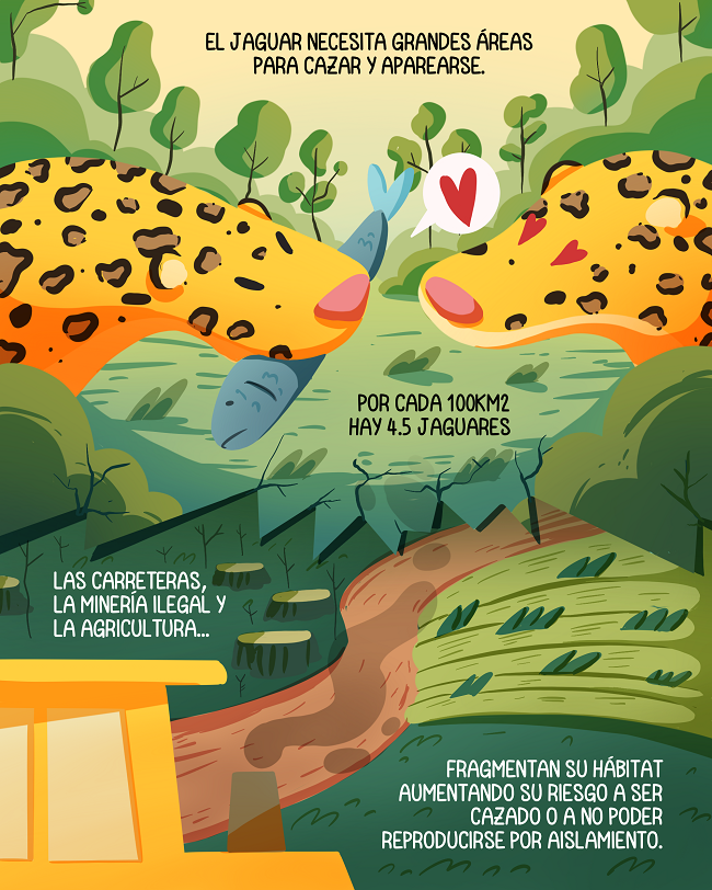 El jaguar, como otros “depredadores tope”, necesita movilizarse grandes áreas para cazar y reproducirse. De acuerdo con datos del Serfor, por cada 100 km2 de zonas protegidas habitan alrededor de 4.5 jaguares.
