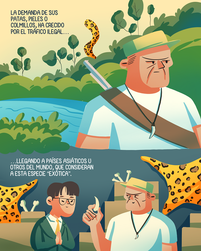 Adicionalmente, la caza furtiva para satisfacer el tráfico ilegal de esta y otras especies ha crecido en los últimos años. El jaguar es codiciado por sus patas, pieles, colmillos y huesos, los cuales son vendidos en mercados asiáticos y de otros países del mundo, incluyendo Latinoamérica, en los cuales consideran a esta especie como exótica.
