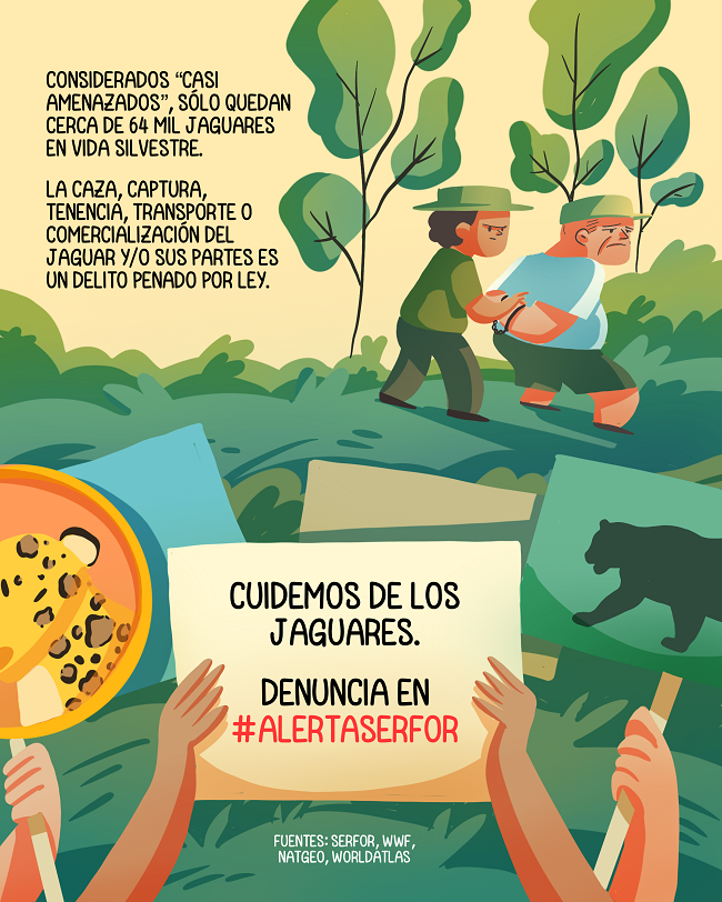 La caza, captura, tenencia, transporte o comercialización del jaguar y/o sus partes es un delito penado en la legislación nacional. Como ciudadanas y ciudadanos responsables, pueden evitar ser cómplices del comercio ilegal de esta especie denunciando en la app de #AlertaSERFOR, al correo alerta@serfor.gob.pe o a la línea 947588269, cualquier presunto caso de caza, comercio y venta de este majestuoso y mítico animal.