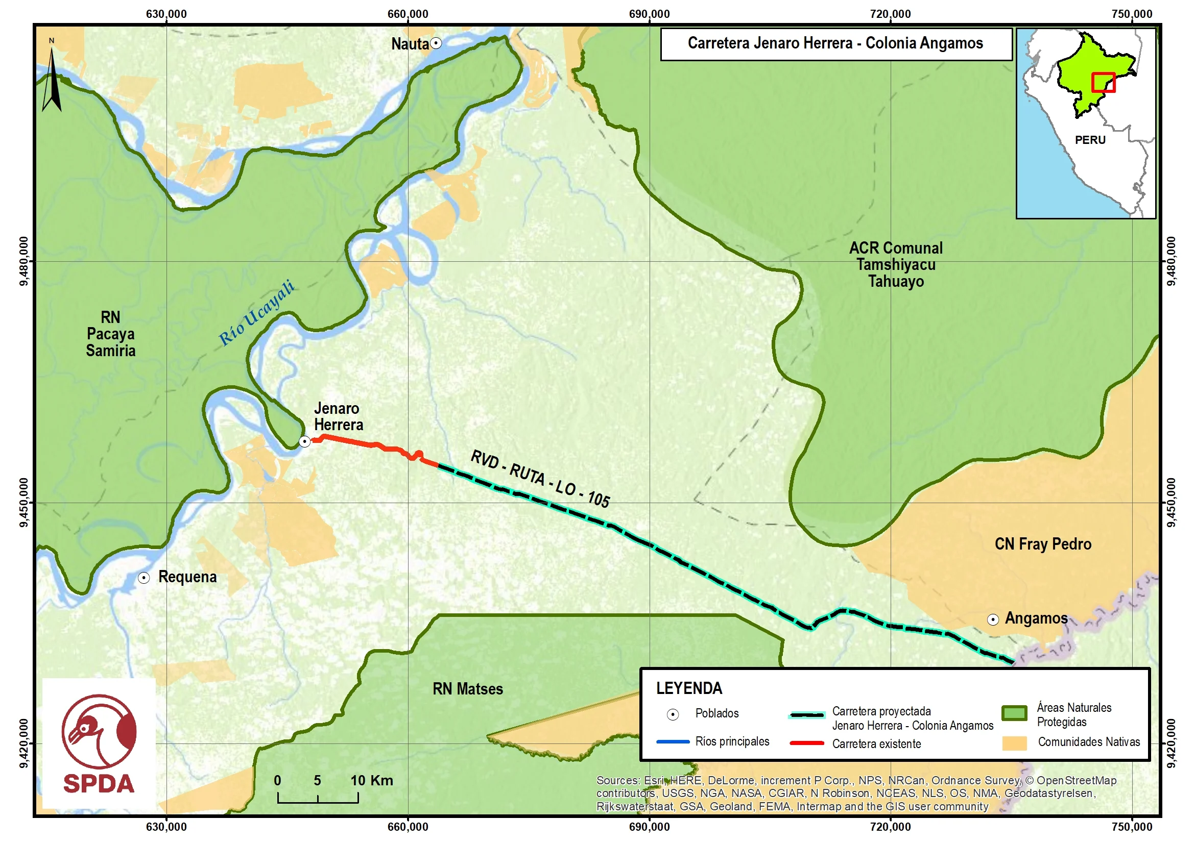 - Mapa donde se puede apreciar la carretera proyectada entre Jenaro Herrera y Angamos, y donde se puede ver también el trayecto hasta Requena.