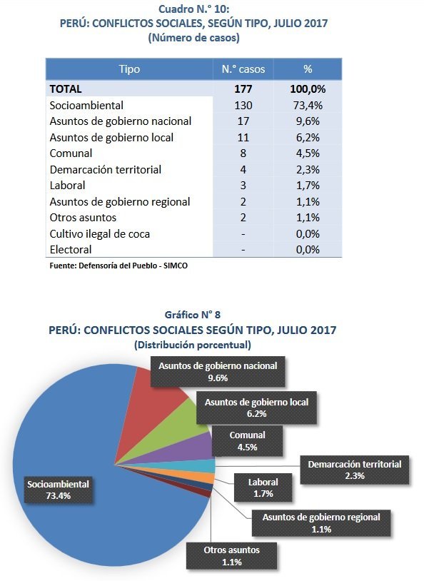 En su reporte correspondiente al mes de julio, la Defensoría del Pueblo registró 177 conflictos sociales (115 activos y 62 latentes), de los cuales los casos socioambientales son los más numerosos (73,4%) y, de estos, el sector minero es el predominante (64,6%).
