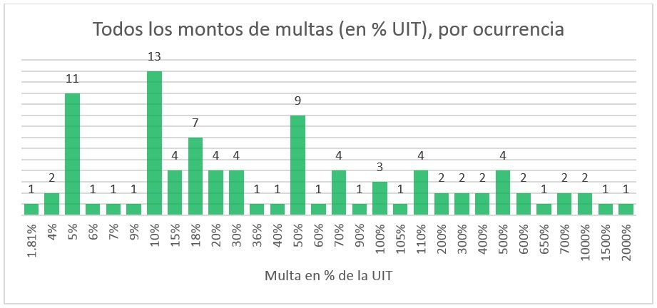 En total, SERNANP registra 155 sanciones, de las cuales un poco más de la mitad son multas y el resto amonestaciones. Las multas van desde montos muy pequeños, como 1.81% de la UIT en el 2011 (alrededor de S/. 65), por ingreso sin autorización, hasta muy grandes de 2,000% de la UIT en el 2012 (S/. 73,000) por destrucción de ecosistemas. De todas las infracciones, la más común ha sido ingresar a un área natural protegida sin autorización, con 104 ocurrencias sancionadas (entre amonestaciones y multas). En total, todas las multas ascenderían a cerca de S/. 400,000 en cuatro años. En relación con la extensión de territorio que tiene que proteger y comparado con las sanciones ambientales de otras instancias como OEFA, este monto es bastante pequeño.