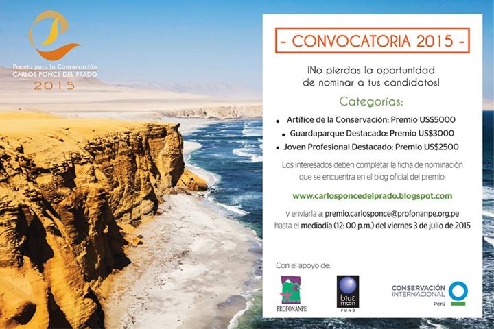 Por séptimo año consecutivo, el Fondo Carlos Ponce del Prado convoca a la nominación de candidatos para la edición del Premio para la Conservación Carlos Ponce del Prado 2015 en sus tres categorías: Artífice de la conservación, Guardaparque destacado y joven profesional destacado.