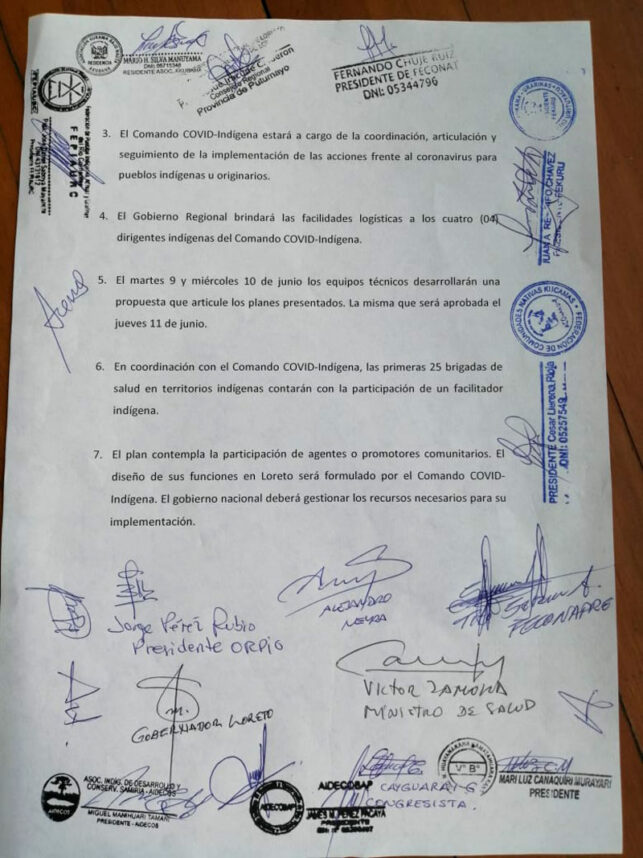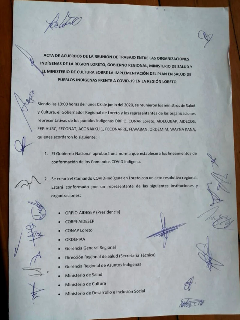 Ante a la demanda de los pueblos indígenas de Loreto para recibir atención frente al COVID-19, y sobre todo para ser escuchados e incluidos a través de sus organizaciones en la elaboración de los planes y la ejecución de estos, los ministros de Cultura y de Salud, representantes de los pueblos indígenas y el Gobierno Regional de Loreto (Gorel) acordaron la conformación del primer un Comando COVID-19 Indígena.