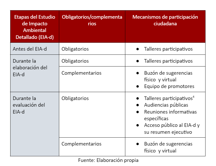 Por esta razón, urge contar con un nuevo marco normativo que permita una implementación efectiva de los mecanismos de participación ciudadana y garantice el involucramiento y participación de la ciudadanía, con criterios, procedimientos y responsabilidades claras, respecto de los tipos de mecanismos que se pueden implementar de acuerdo con el tipo de estudio de impacto ambiental (EIA-d, EIA-sd o DIA).