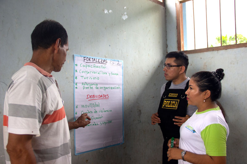 Los vigilantes realizaron el ejercicio de reconocer sus fortalezas y debilidades, y luego identificaron las acciones que efectúan antes, durante y después de una intervención. Estas actividades le permitieron a los representantes de la Autoridad Regional Ambiental (ARA) de Loreto revisar cómo están funcionando las OLV, qué aspectos faltan reforzar y qué funciona mejor para ellos.