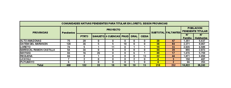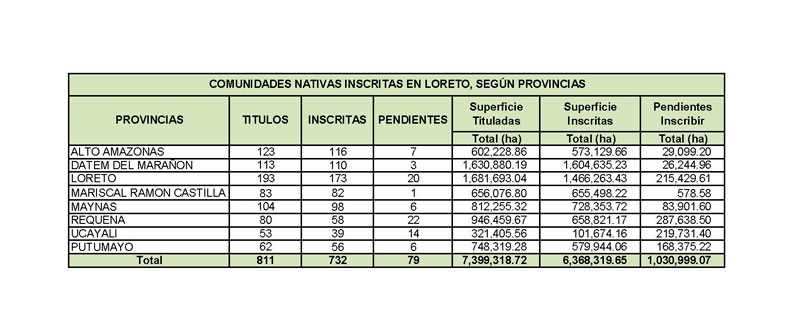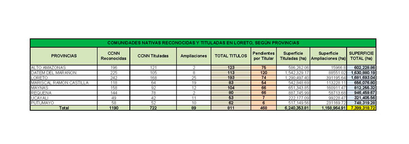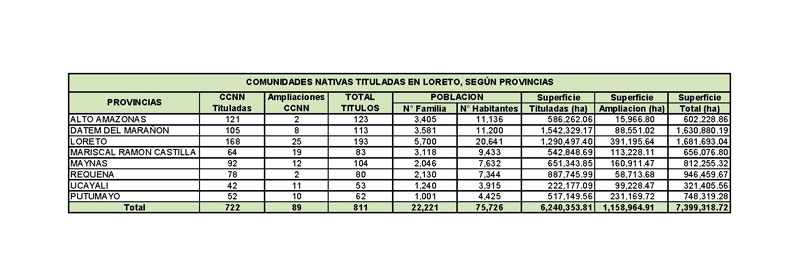 A la fecha, se han titulado 7 399 318.72 hectáreas de territorio indígena, ubicados en las provincias de Alto Amazonas, Datem del Marañon, Loreto, Mariscal Ramón Castilla, Maynas, Requena, Ucayali y Putumayo. Este número resulta de la suma de la superficie titulada y ampliaciones efectuadas hasta el primer semestre del año en curso.