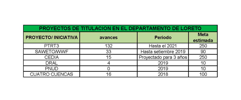 La titulación de comunidades se trabaja a través de proyectos. En Loreto están vigentes 6 con los que se espera avanzar 510 procesos más. Esto quiere decir nuevas titulaciones, rectificaciones y ampliaciones.