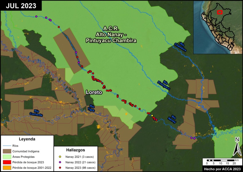 Según el mismo estudio, solo entre 2022 y 2023 se identificaron 122 infraestructuras mineras en esta cuenca, esto es el 43 % del total de las dragas halladas en 11 ríos de Loreto. En este contexto, en agosto del 2023, el Instituto Geológico, Minero y Mitalúrgico (Ingemment) aprobó una concesión minera con un área de 1000 hectáreas.