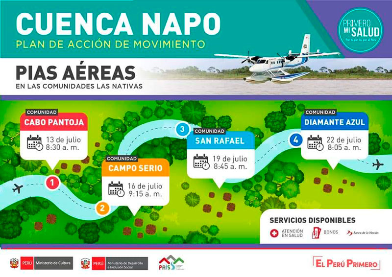 Luego de más de 100 días de iniciada la emergencia del COVID-19 en Perú y con más de 2500 casos confirmados en población indígena en la región Loreto, las Plataformas Itinerantes de Acción Social (PIAS) volverán a recorrer las comunidades amazónicas, pero esta vez vía aérea. Según anunció el Ministerio de Cultura (Mincul), las PIAS aéreas visitarán comunidades en 6 cuencas de Loreto, como parte de una primera intervención que durará hasta el 29 de julio.