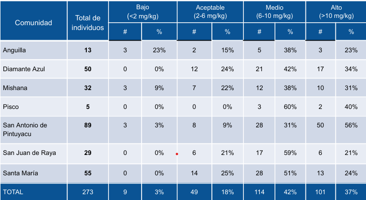 De acuerdo a la evaluación realizada a 273 personas, 284 peces, y en seis comunidades, existen altos niveles de exposición a mercurio en comunidades asentadas en las cuencas de los ríos Nanay y Pintuyacu.