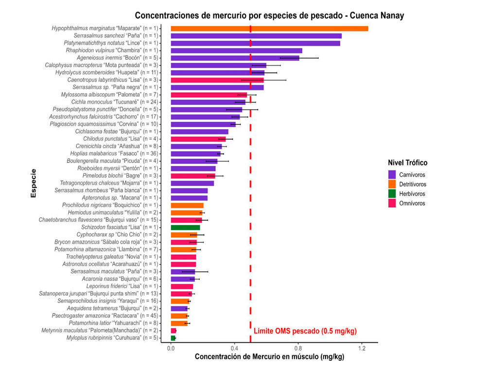 Concentraciones promedio de mercurio en músculo de pescado (mg/kg) según especies colectadas en la cuenca del Nanay. Los colores indican cada nivel trófico, la línea punteada roja indica el límite de 0.5 mg/kg establecido por la OMS para mercurio en pescado destinado al consumo humano. En paréntesis se observa el número de individuos capturados por especie. Imagen: Cincia