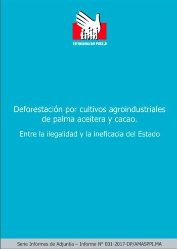 Según la Defensoría del Pueblo, debido a las deficiencias del Estado, la deforestación sigue avanzando en nuestra Amazonía y una de sus causas es el cultivo a gran escala que, entre los años 2010 y 2014, ha reemplazado 30 773 hectáreas de bosques amazónicos por campos de palma aceitera y cacao en regiones como Loreto, Ucayali y San Martín.