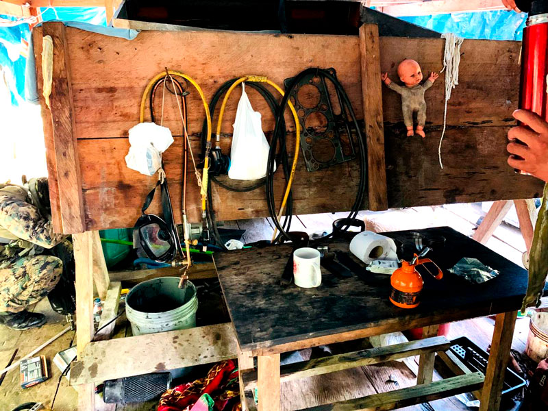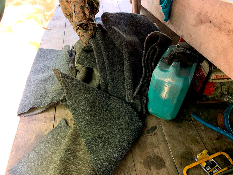 En dichas balsas se hallaron motores, mangueras de succión, equipos de buceo, compresoras de aire, grupo electrógeno, varios metros de alfombras y un peque peque. Además, suministros de alimentos y combustible en gran cantidad.