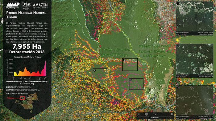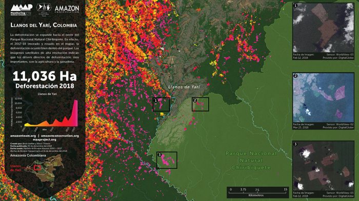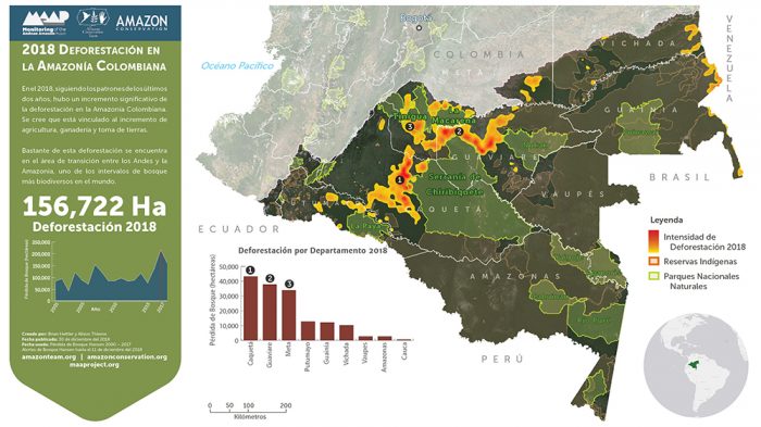 En el 2017, la Amazonía colombiana registró el mayor indicador de deforestación de los últimos 18 años, con 214 744 hectáreas. Según un reporte de Monitoring of the Andean Amazon Project (MAAP), el 2018 podría ser el segundo pico registrado ya que actualmente registra 156 722 hectáreas (basados en datos de alertas tempranas).