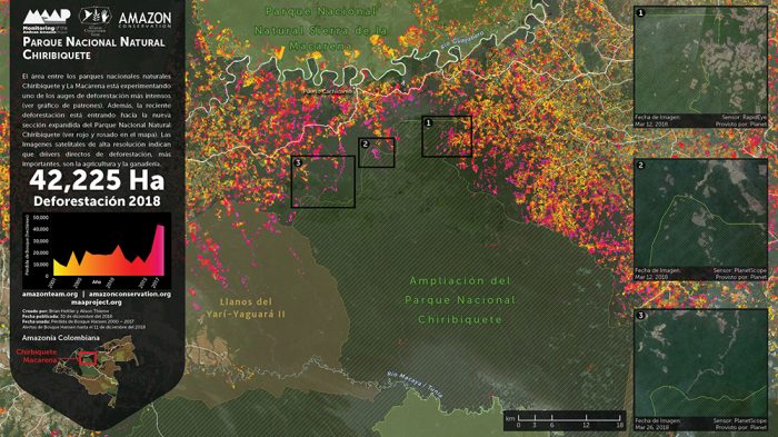 Chiribiquete – La Macarena: se puede ver cómo la deforestación está llegando a la nueva zona de ampliación del Parque Nacional Natural Chiribiquete.